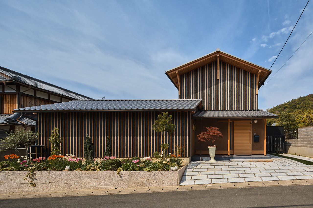 - 田畑が広がり里山の懐かしい雰囲気が残る京都市右京区北嵯峨に完成した新築注文住宅です。のどかな風景に調和する焼杉板を使った外観は杉板の押縁を組み合わせ黒と白のコントラストが印象的な意匠をつくりだしています。