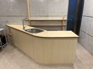 今回造作家具では、カウンター天板の端部を縁取るチーク材を「45°に曲げる」 という難しい製作がありました。