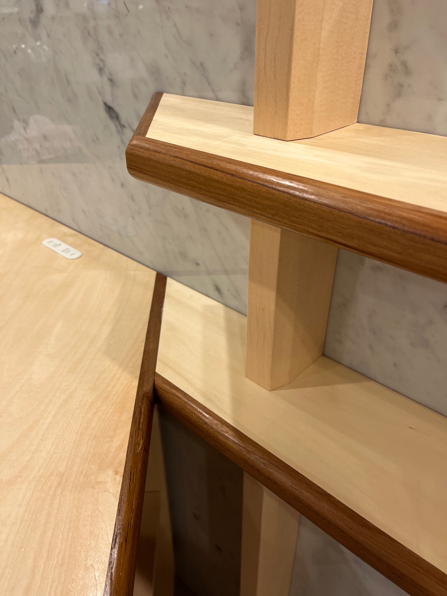 今回造作家具では、カウンター天板の端部を縁取るチーク材を「45°に曲げる」 という難しい製作がありました。