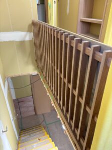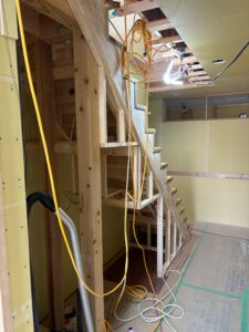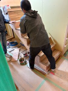大工さんが階段の施工を進めており、ササラ桁を取り付けるための下地づくりから、作業が行われています。