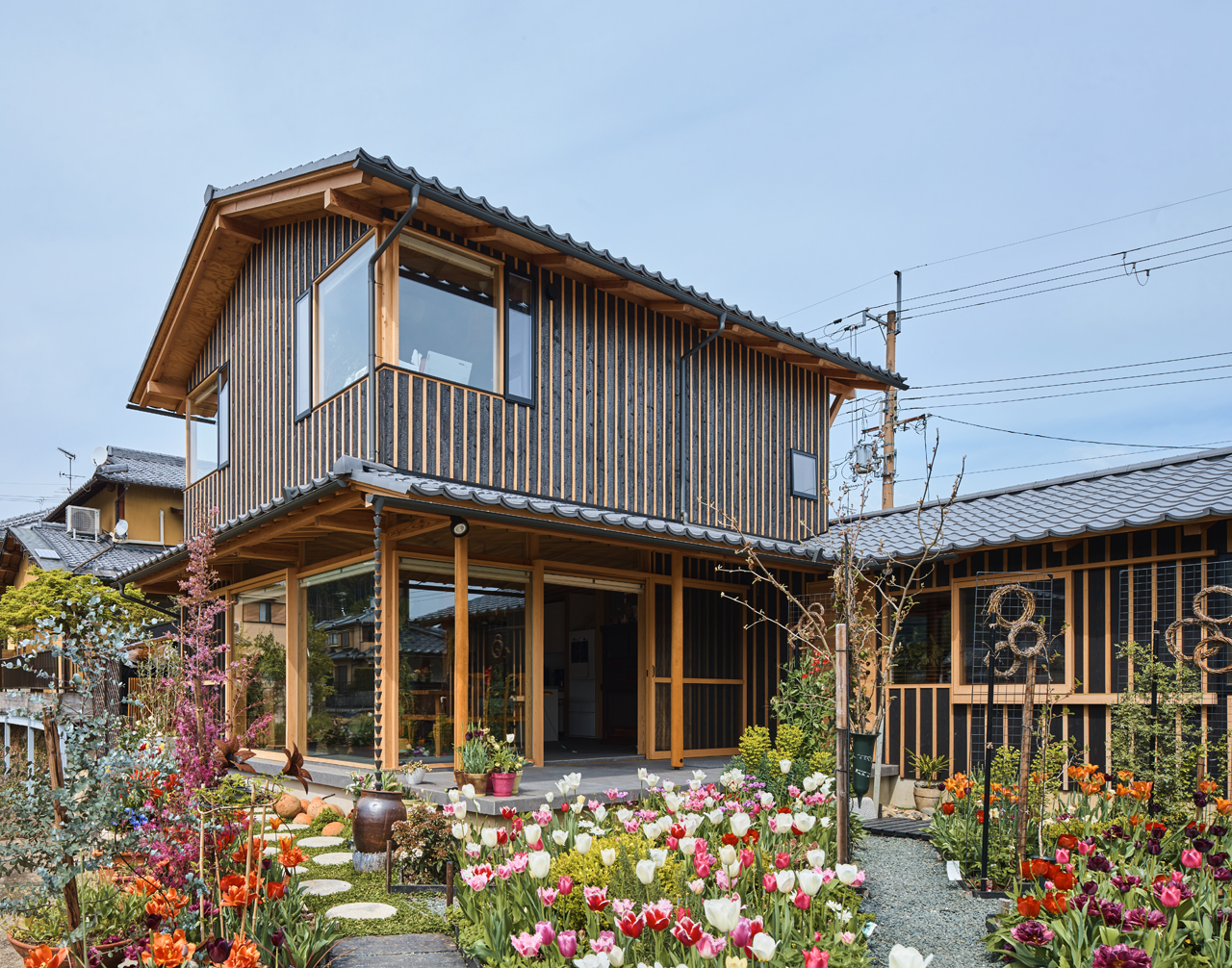 京都市右京区「北嵯峨の家(O邸)」 特徴 田畑が広がり里山の懐かしい雰囲気が残る京都市右京区北嵯峨に完成した新築注文住宅です。のどかな風景に調和する焼杉板を使った外観は杉板の押縁を組み合わせ黒と白のコントラストが印象的な意匠をつくりだしています。 周囲の眺望を取り込んだ開放感のあるリビングは、中心に八角形に加工した無垢桜材の化粧柱があります。 内外部を貫く付け垂木と化粧板を使用した勾配天井が大きな開口に向かって伸び、外部の景色を取り込んだ拡がりのある空間となり、 リビング、テラスから望む眺望が秀逸です。 玄関、テラスは大きく出た庇を北山磨き丸太の独立柱が支え、玄関周りは軒天、天井ともに無垢杉板を使用しています。 来客の多い住まい手さまに合わせて、リビングなどのパブリックゾーンと、主寝室や水周り空間があるプライベートゾーンを使い分けられる動線になっていて、 お客様用としても使える、個室とシャワールームが計画されています。 構造 木造2階建て 種別 新築 場所 京都市右京区 設計 高橋勝建築設計事務所 竣工 令和5年3月 延床面積 122.24㎡(1階:81.29㎡ 2階:39.75㎡)>Look at this construction example - 2025年9月18日