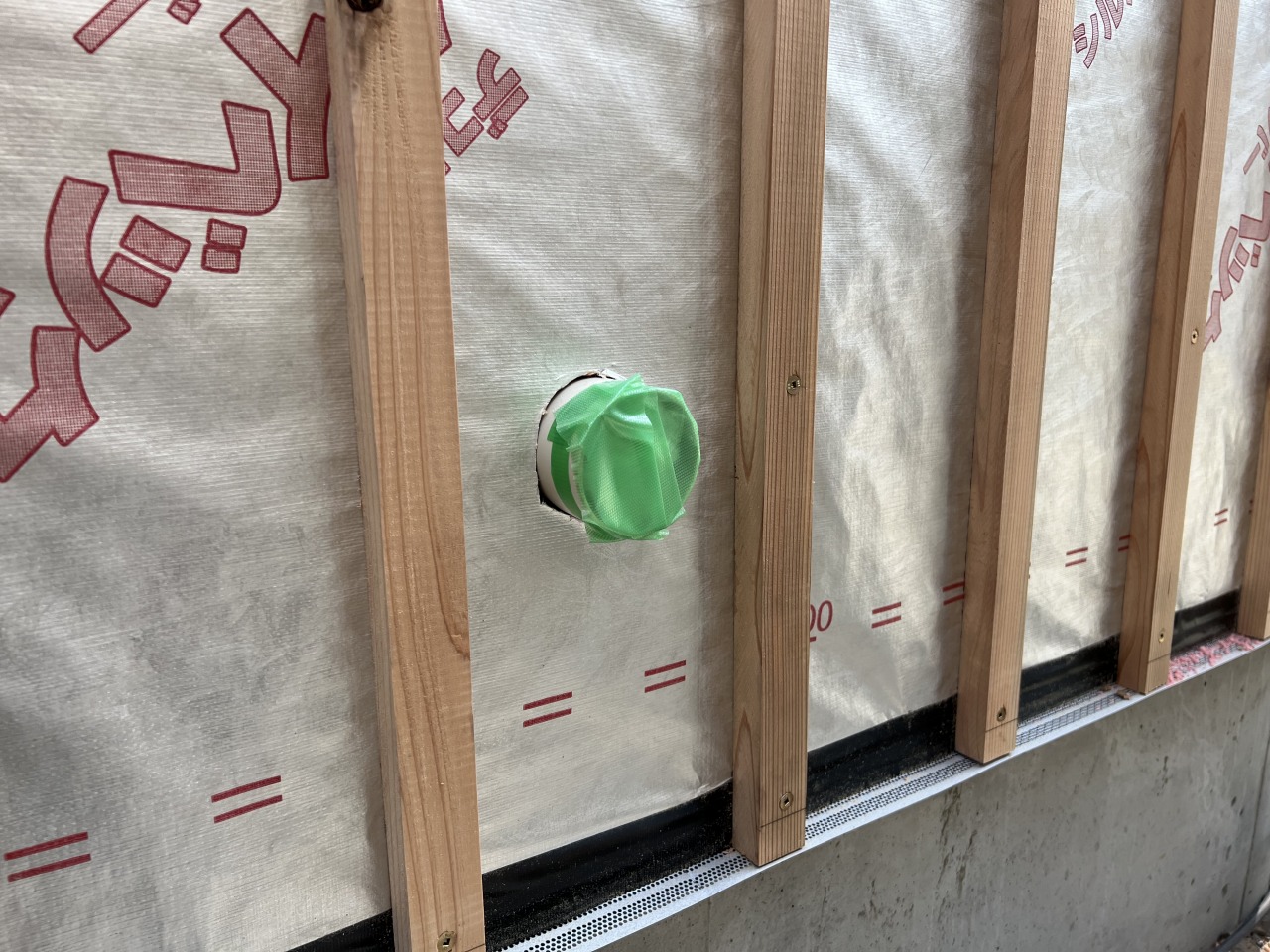 このタイミングで気密測定を行う理由は、スキマがあった場合、場所の特定がしやすく、手直しができるからです。