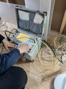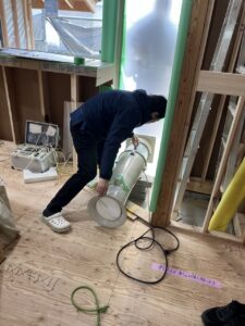 今の段階で気密性が十分に確保されているか確認するため、中間気密測定を行いました。