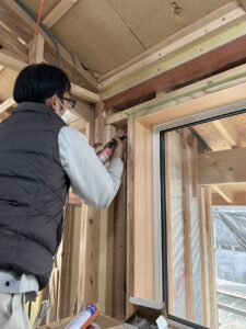 煙を確認した部分は、コーキングやウレタンフォーム、気密テープ等を使って、スキマを塞いでいきます。