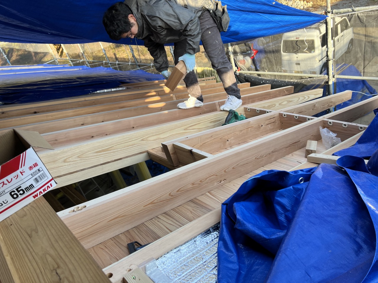 屋根部分は、化粧垂木、化粧野地、その後に野垂木を取付、無垢材の野地板を張るという手順で施工をしています。