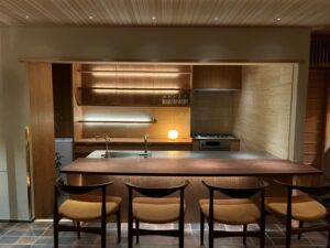 奥の厨房カウンターからは、ラウンジと和室を見渡すことができます。