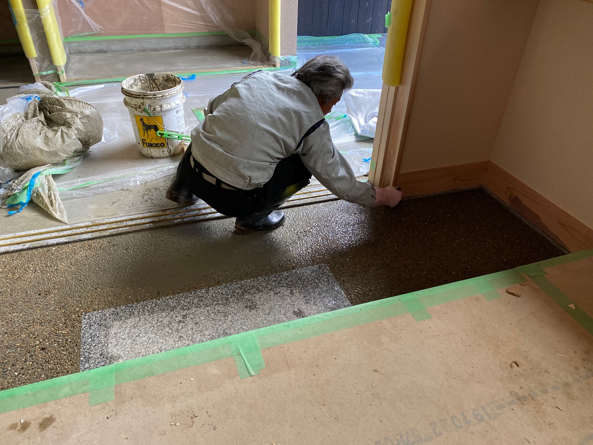 左官屋さんが刷毛を使って、最後の仕上げに取り掛かっております。